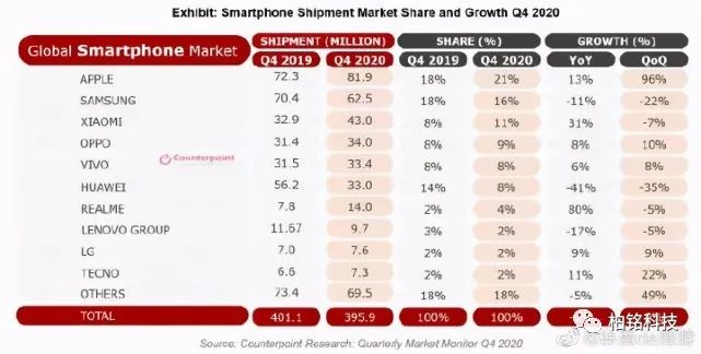 据counterpoint公布的这份数据,2020年Q4华为手机占全球手机市场的份额已仅剩下8%左右,在华为手机大幅衰退的情况下,小米、OPPO、vivo和realme正在快速夺取市场,其中小米和realme成为最大获益者。