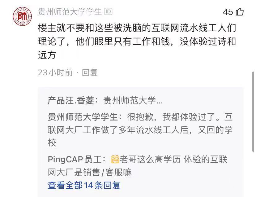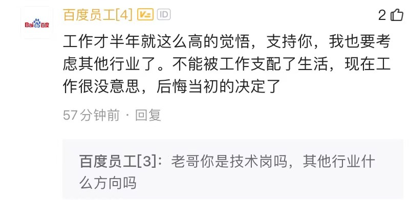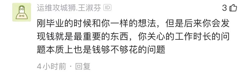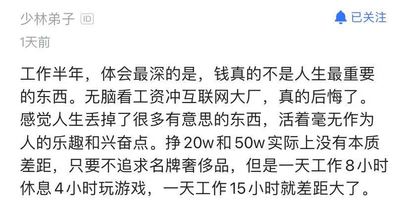 有位员工在社交平台发表自己对赚钱的观点:工作半年,体会最深的就是,钱不是人生重要的东西。因为工资无脑冲物联网大厂,已经后悔,觉得人生丢了很多有意思的东西,或者没有乐趣跟兴奋点。挣20w和50w实际上没有本质差距,但是一天工作8小时休息4小时,和一天工作15小时就差距大了。