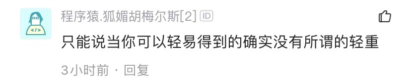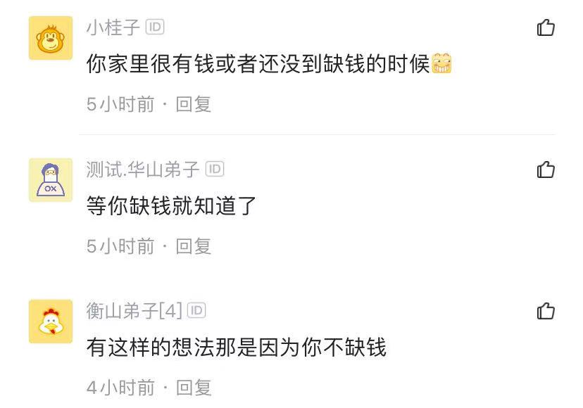 不少网友觉得这是还没到真正想用钱或者缺钱的时候呢,等你缺钱就知道了,体会到没钱的难处,才能理解那拼命赚钱的心情。因为轻易可得到,所以没有所谓的轻重。