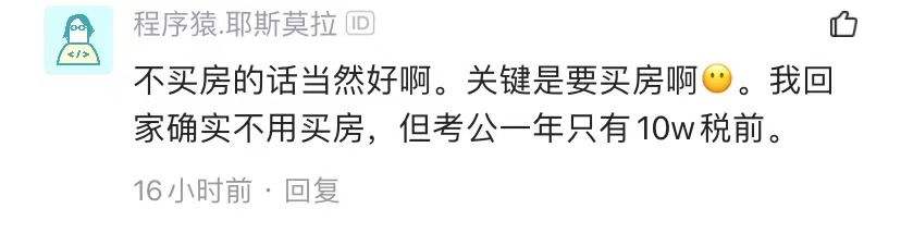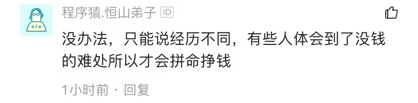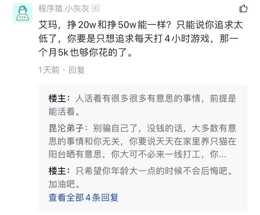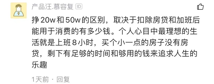 还有网友觉得是因为你没买房才觉得没区别,买房就知道了,先不说首付,连后续月供都受限。挣20w和50w的区别,取决于扣除房贷和加班后能用于消费的有多少钱。当然理想的生活还是上班8小时,剩下有足够时间和够用的钱追求人生乐趣。
