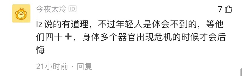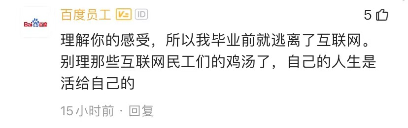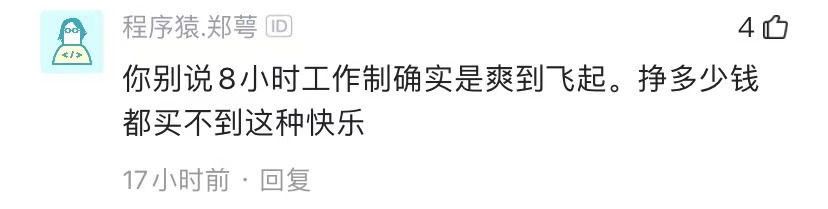 也有很多网友赞同表示不能被工作支配了生活,现在工作很没意思,自己的人生是活给自己的,当身体各个器官出现问题时就会后悔莫及。并且八个小时的工作制确实是挣多少钱都体会不到的快乐。