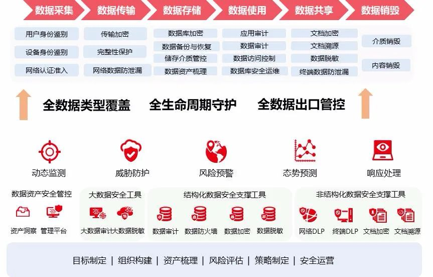 伴随数字经济的高速发展,数据的防护理念也需要与时俱进。企业不能只是简单地部署安全产品,而应从组织架构、制度流程、安全措施和人员能力等多方面入手,在数据全生命周期各个采取数据可信接入、数据加密、数据脱敏、认证授权、数据操作审计等措施,通过持续监测数据的变化和流转,随时管控数据的风险信息,从而形成体系化的数据安全能力。