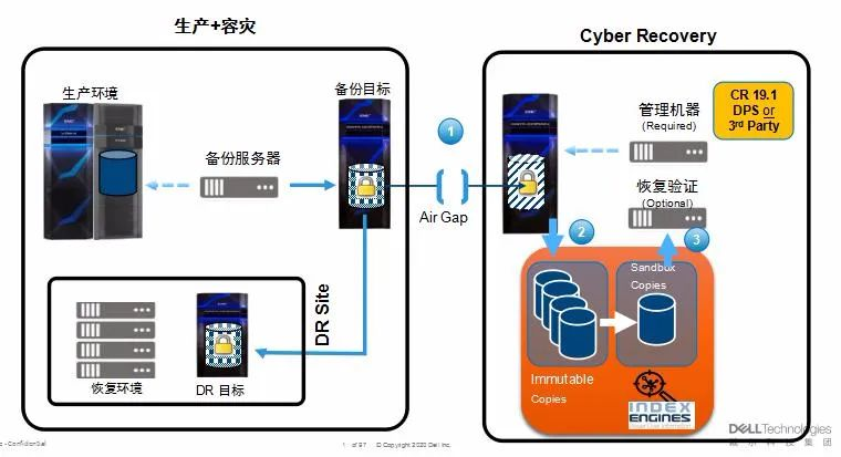戴尔的“避风港”(Cyber Recovery Vault)方案为勒索病毒及破坏性网络攻击提供了全面的解决方案。这是一个成熟的解决方案,在市场上已经有5年的时间,服务了数百个客户。数据自动复制软件自动同步生产系统和保险库之间的数据,并在复制完成后创建弹性网络隔离,也被称为空气间隙技术(Air gap),通过快速拷贝生成不可变的副本,并设定副本数据保留锁定策略。如果发生网络攻击,用户可以快速识别干净的数据副本,恢复关键系统,并使业务重新运行。