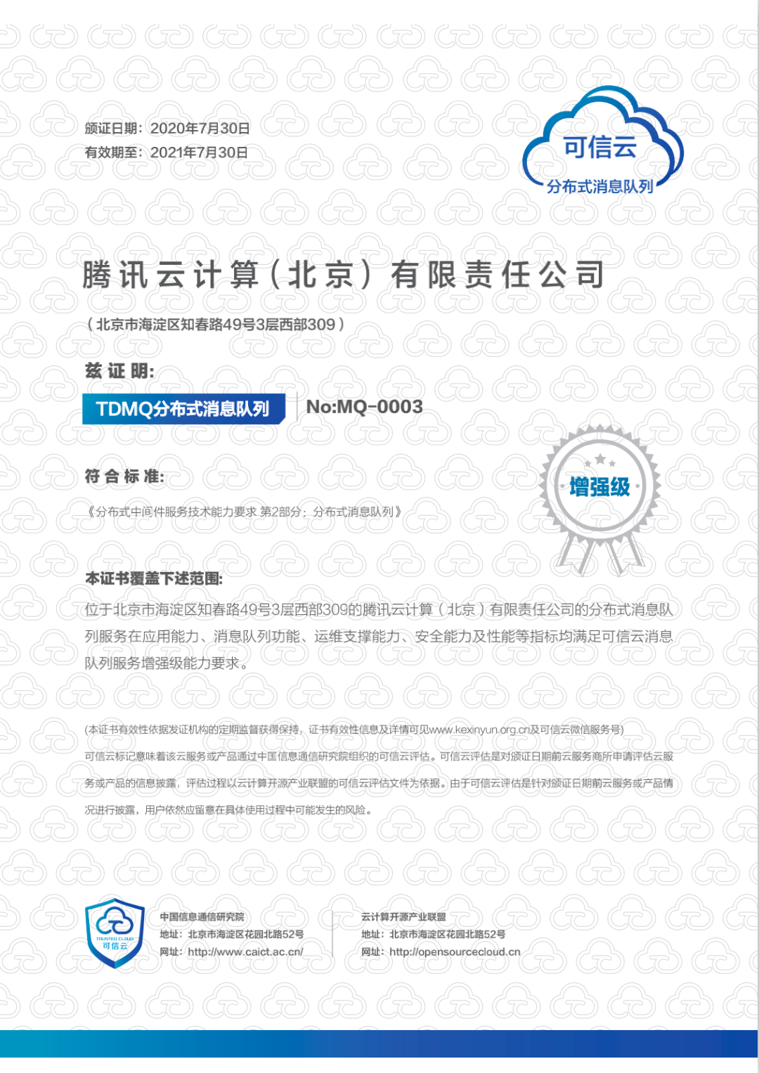 导语:由中国信息通信研究院、中国通信标准化协会联合主办的“2020可信云大会”于昨天圆满结束,会上发布了2020年可信云上半年最新评估结果。其中腾讯云中间件——分布式消息队列TDMQ凭借其优秀的技术能力,获得了可信云最高级认证证书。