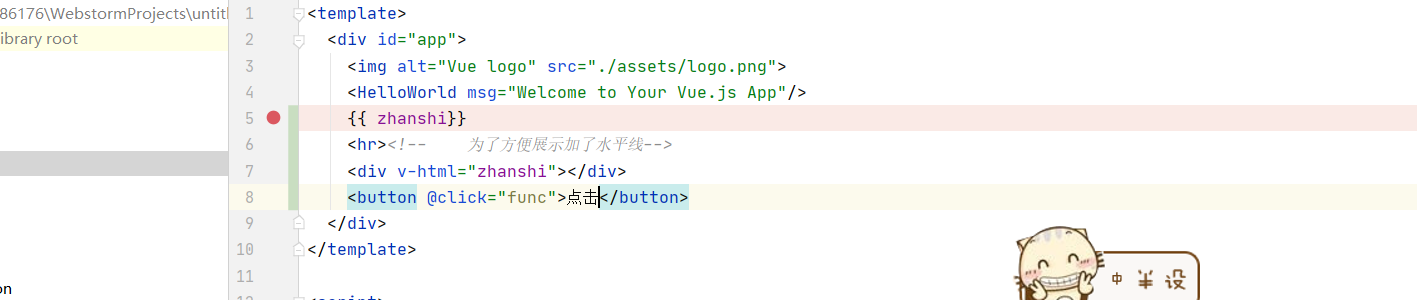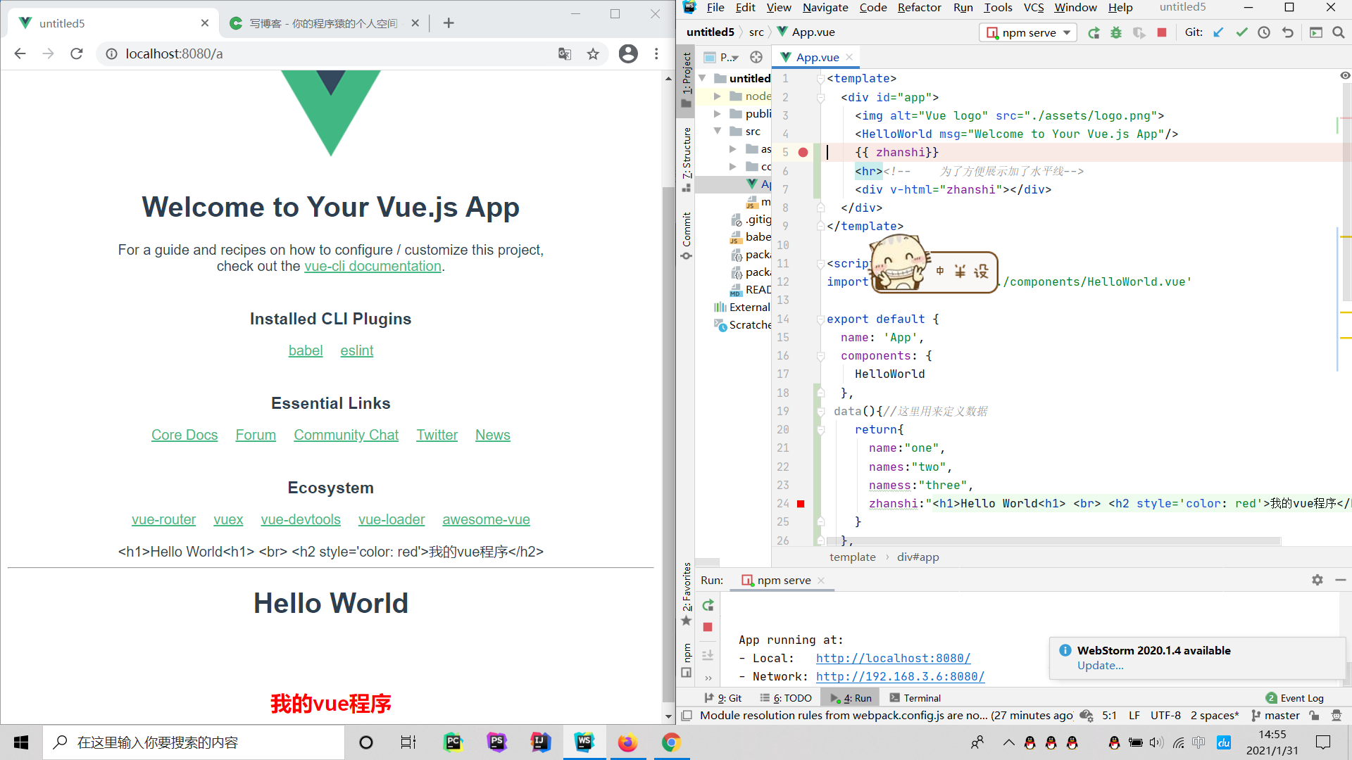 模板语法的结构基本上是这样的。当然这里有一点值得强调就是在template下只允许有一个根就是那个叫App的盒子。这里我们要说的是插值表达式。他的作用就是将data中的数据或者是其他的一些数据渲染进DOM中但是不同的是他是不会解析HTML中的标签的。在data中 的数据是怎样的在网页 中渲染出来的就是怎样的。如果想被解析的话你需要用到v-html这个语法。具体的效果我会用图片展示。