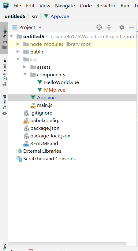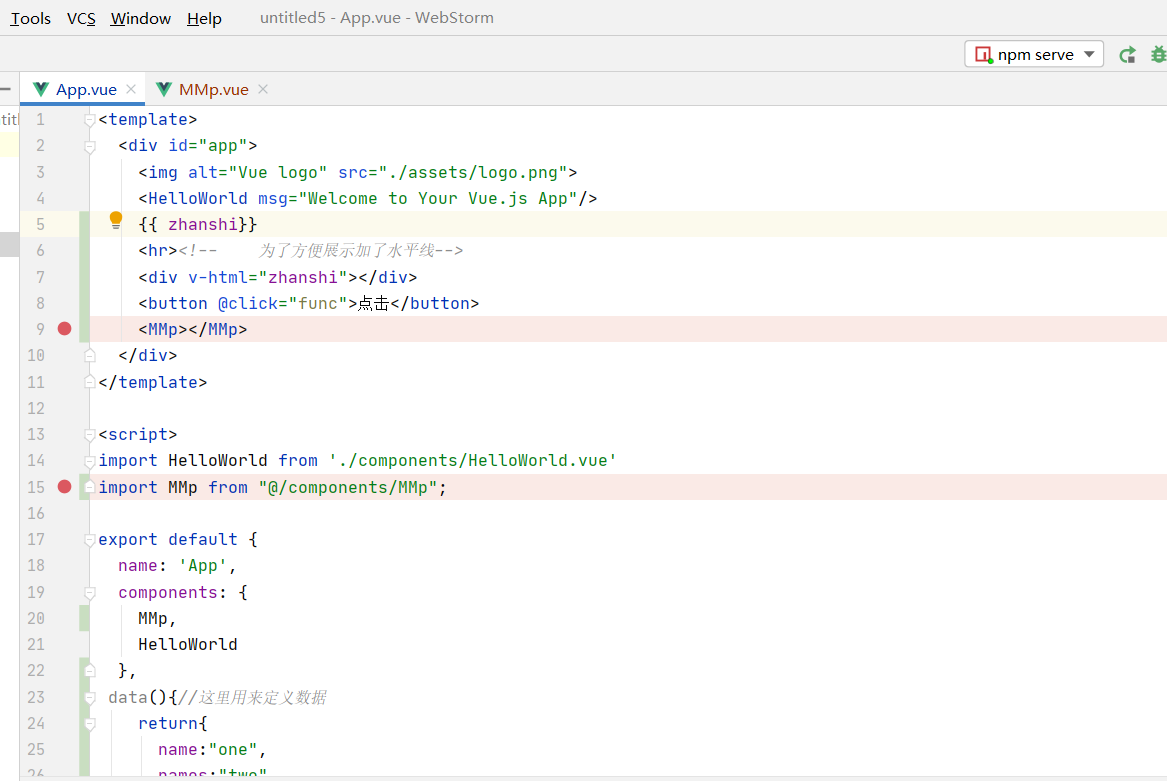 看这个目录下的components文件夹这就是组件文件夹我在这个文件夹下新建了一个叫做MMp的组件。当组件新建完成后接下来就是在App中引入这个组件了具体就看图吧。我用debug(红色圆点)的形式给你们标记粗来了。