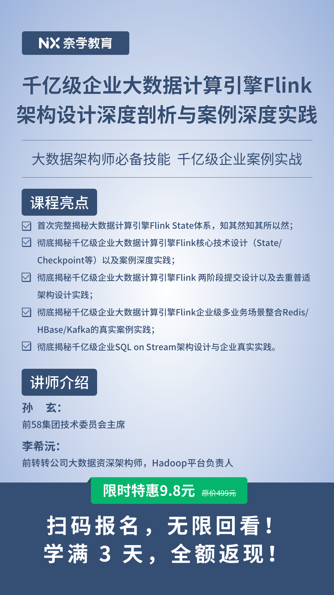 如果你想快速掌握阿里奉为“神器”的Flink计算引擎,我推荐你学习由前58技术委员主席孙玄联手58到家 CTO 沈剑老师,结合 10 多年一线大厂实践经验,打造的《大数据架构师必备技能—千亿级企业大数据计算引擎Flink State架构设计深度剖析与案例深度实践》在线专栏课。3天时间,直接让你在实践中了解Flink State架构设计的原理,学完能轻松应对大厂大数据资深开发/架构师面试!