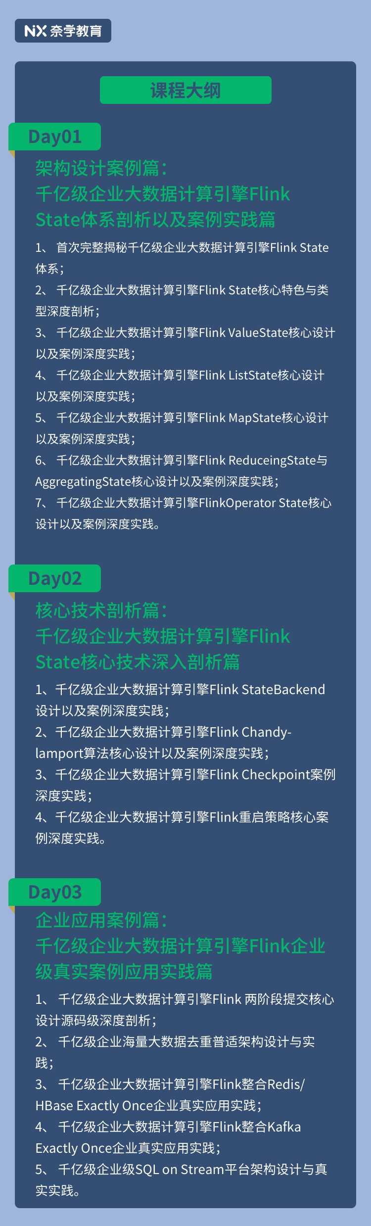 学习最怕不成体系。如果你还在碎片化学习中消耗精力,我建议你花3天时间,每天集中学习几小时,通过课前问答、讲师答疑、课后作业等闭环训练,快速有效地学习复杂的Flink高阶架构设计思维,实打实获取企业级PB大数据中台项目真实业务历练机会。