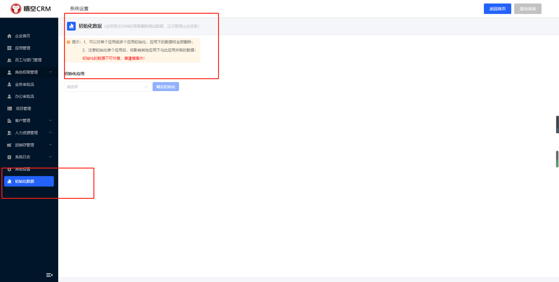 4、管理后台新增数据初始化,方便试用系统后需要正式使用的用户快速清空测试数据。