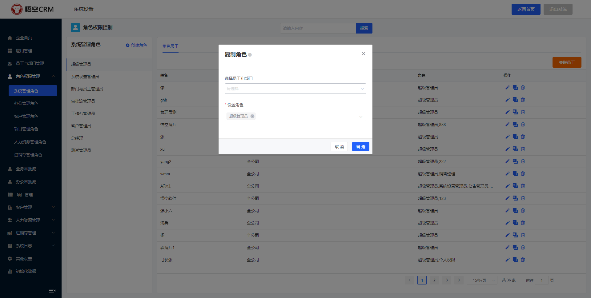 3、管理后台新增复制员工角色功能,可以将单个员工的全部角色复制给多个员工,便于管理员工权限。