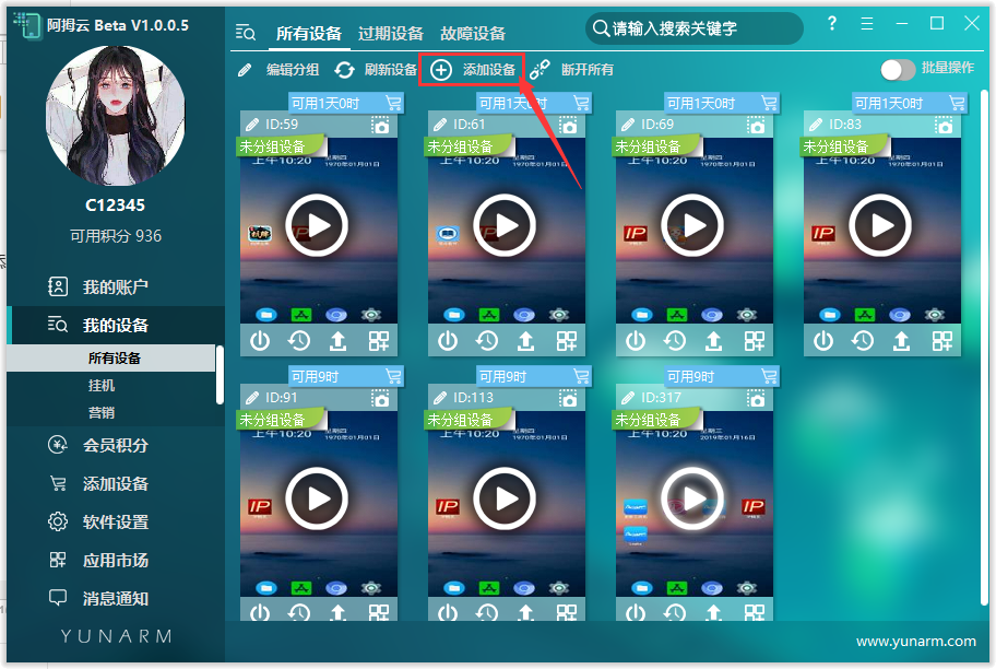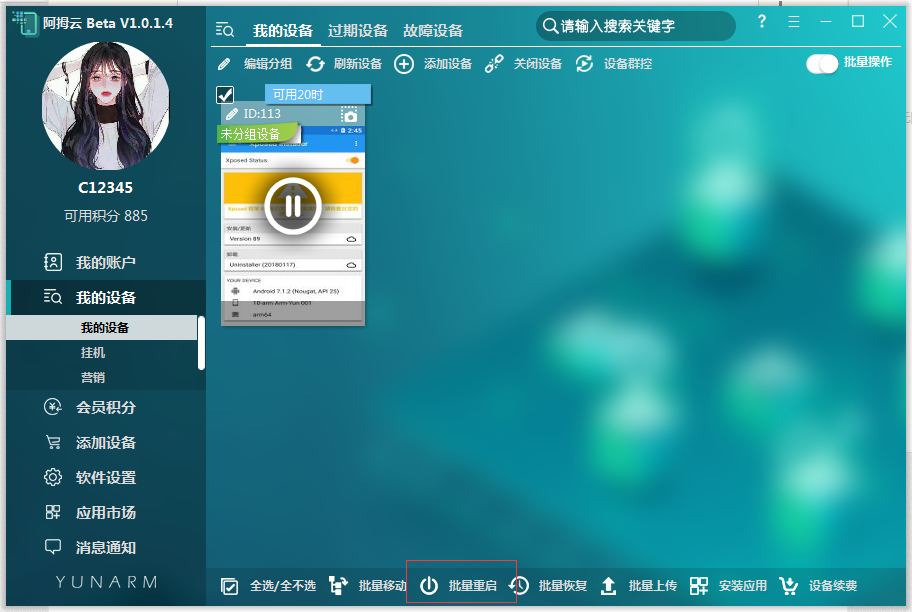 第四部,安装更新完成后,阿拇云手机群控界面批量操作重启手机
