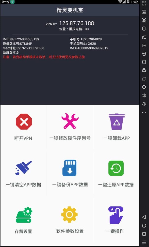 第七步,登陆成功后可开始一对一设置你的手机设备,选择一键修改硬件序列号,设置vpn独立手机ip避免微信营销封号!