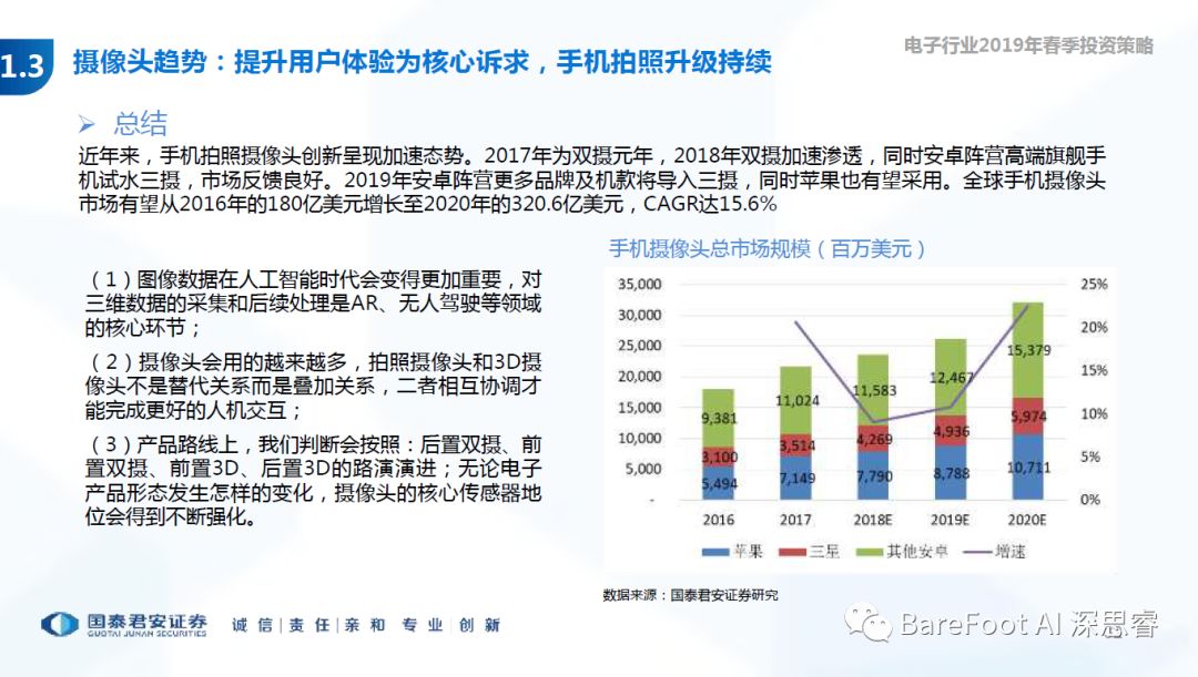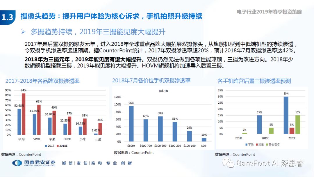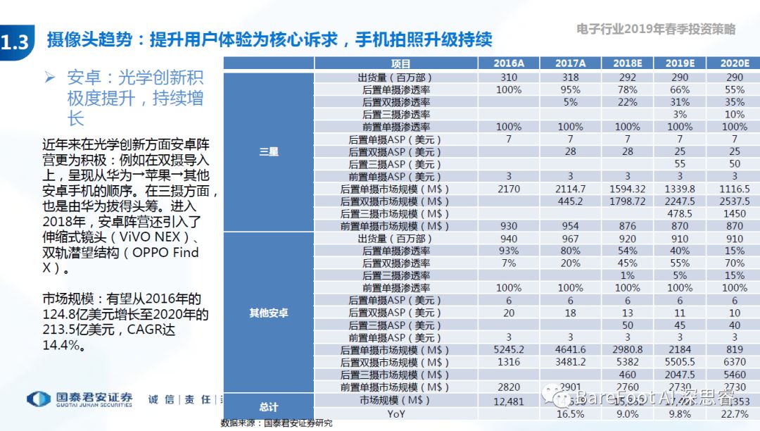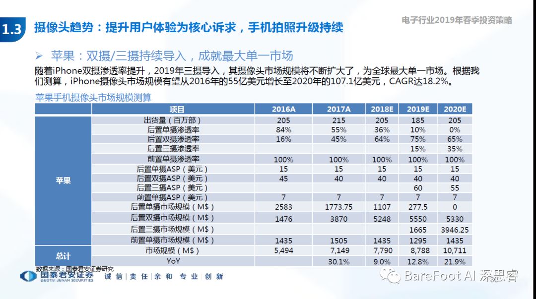 睿点评 - 以用户体验为核心,成就了苹果,也是国内厂商追赶的目标。单射ASp - 15USD,双摄ASP - 40USD,三摄ASP - 55USD。