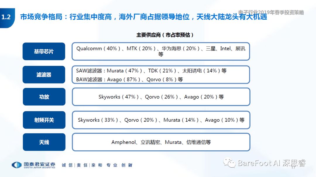睿点评 - 国内厂商仍然集中于技术含量较低的天线部分。唯华为海思在基带芯片的重大突破,一枝独秀。厂商仍然以美,日厂商为主。