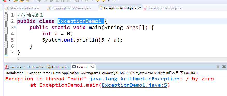 | //异常示例1 public class ExceptionDemo1 { public static void main(String args[]) { int a = 0; System.out.println(5 / a); } } |