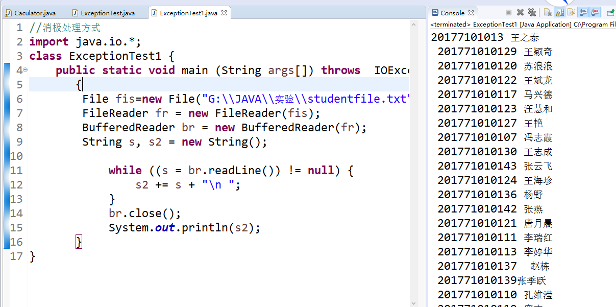 l 下列两个简答程序范例给出了两种异常处理的代码格式。在elipse IDE中编辑、调试运行源程序ExceptionalTest.java,将程序中的text文件更换为身份证号.txt,要求将文件内容读入内容,并在控制台显示;