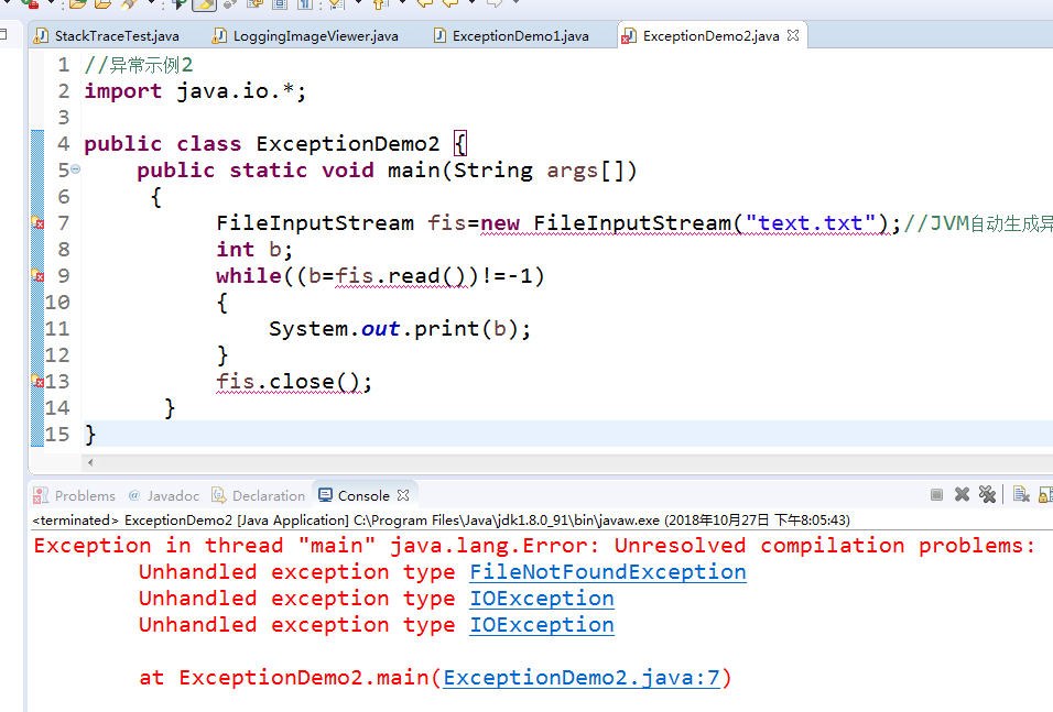 public class ExceptionDemo2 { public static void main(String args[]) { FileInputStream fis=new FileInputStream("text.txt");//JVM自动生成异常对象 int b; while((b=fis.read())!=-1) { System.out.print(b); } fis.close(); } } |