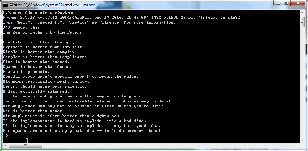 4>.Python哲学(如下图所示,在python解释器中输入“import this”,就可以看到python哲学啦~)