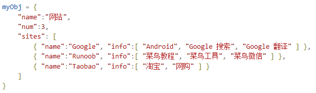 " { \"name\":\"Runoob\", \"info\":[ \"菜鸟教程\", \"菜鸟工具\", \"菜鸟微信\" ] },\n" +