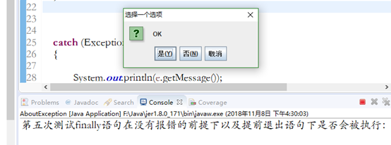 15         System.out.println("第五次测试finally语句在没有报错的前提下以及提前退出语句下是否会被执行:");