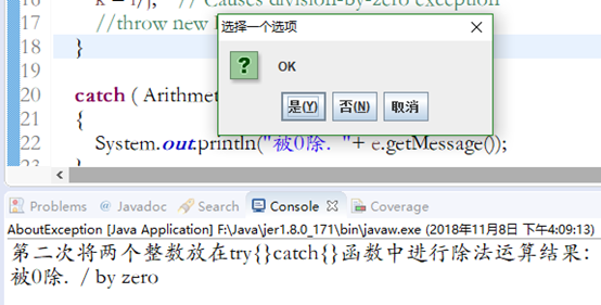 16          //System.out.println("第二次将两个整数放在try{}catch{}函数中进行除法运算结果:");