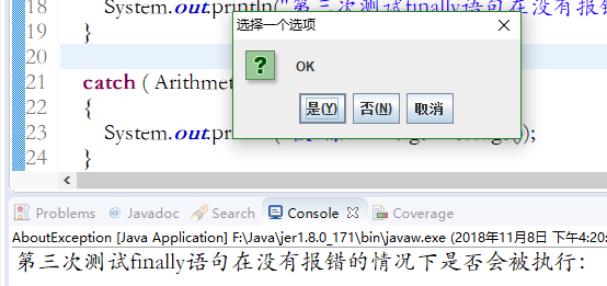 19         //System.out.println("第三次测试finally语句在没有报错的情况下是否会被执行:");