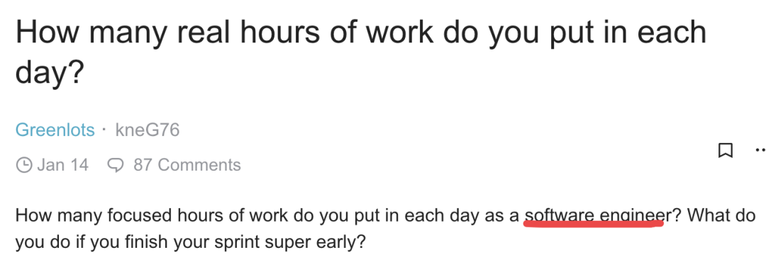 “去年,我每天工作 12~14 个小时。每周 65~70 小时。一周又一周,倦怠开始。而且绝对没有报酬:没有认可,没有晋升,对我没有真正的好处。只是痛苦。现在我每周只工作 44~48 小时。我更专注,更有效率,也更快乐。”