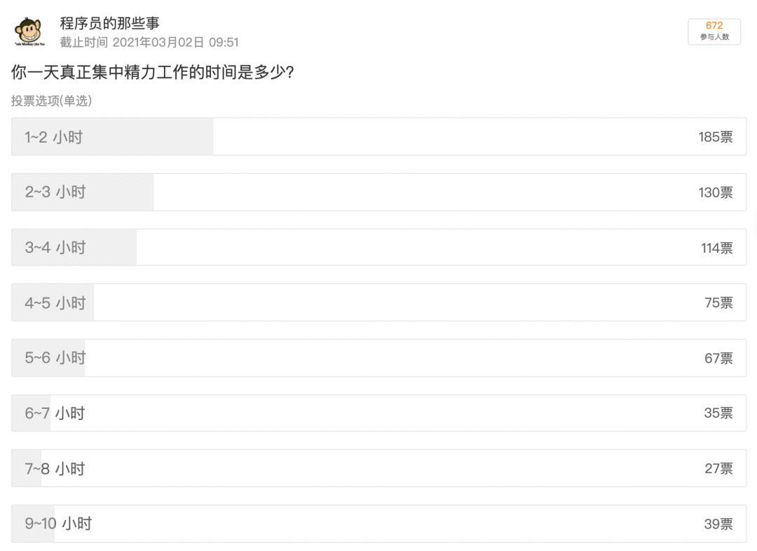 27.5%的人每天专注工作的时间是 1~2 小时;19.3%是 2~3 小时;16.9%是 3~4 小时;