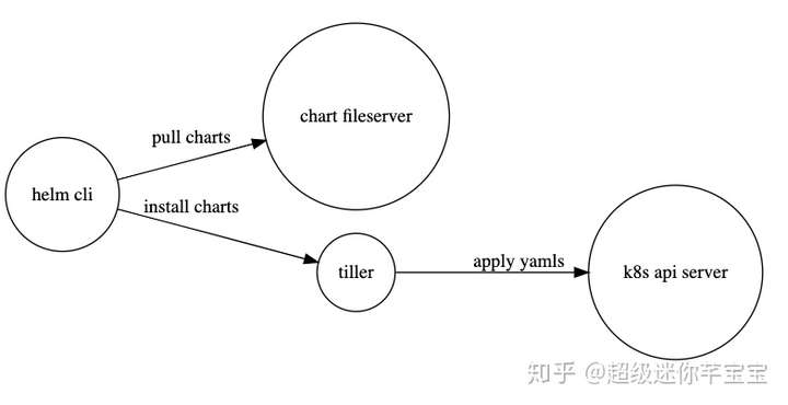 在 Helm 2 中,一次基于 Helm 的软件交付会涉及到多个组件: