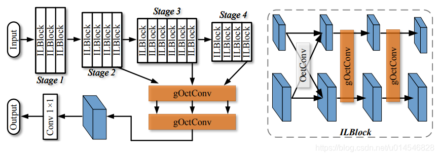 ILBlock 增强了一个阶段内特征的多尺度表示。gOctConvs 被用来在 ILBlock 中引入多尺度。普通 OctConv 需要大约60%的FLOPs[4]才能达到与标准卷积类似的性能,这对于高度轻量化模型的目标是不够的。为了节省计算成本,不需要在每一层中进行不同尺度的特征交互。因此,通过消除跨尺度操作,每个输入通道对应一个具有相同分辨率的输出通道。在每个规模内进行深度操作,以进一步节省计算成本。与普通的 OctConv 相比,gOctConv 实例只需要大约 1/channel FLOPs。ILBlock 由一个 vanilla OctConv 和两个 3x3 gOctConvs 组成,如图3所示。普通的 OctConv 与两个尺度相互作用特征,而 gOctConvs 则提取每个尺度内的特征。对块内的多尺度特征进行单独处理,并进行交互。每次卷积之后是 BatchNorm[30] 和 PRelu[18]。最初,ILBlock 的通道翻倍作为分辨率的降低,除了最后两个阶段具有相同的通道数。除非另有说明,ILBlock 中不同尺度的通道是均匀设置的。