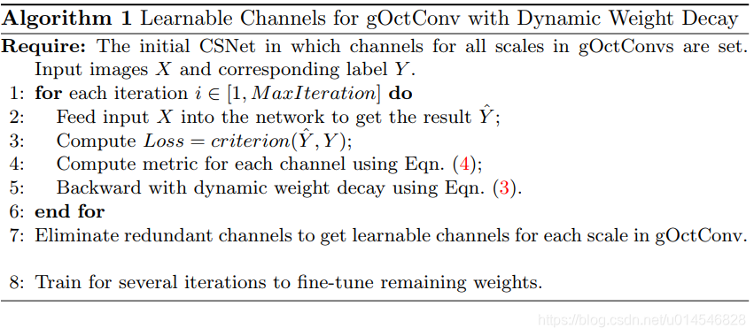 γ 和 β 是学习因子。在训练过程中,将动态权值衰减应用于 γ。图4 (b) 显示重要权重和冗余权重之间存在明显的差距,不重要权重被抑制到接近零 (wi < 1e−20)。因此,可以将 γ 小于一个小阈值的通道移除,得到了 gOctConv 中各分辨率特征的可学习通道。算法1中给出了获取 gOctConvs 学习通道的算法。
