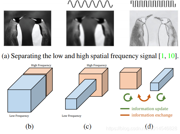 (a) 视觉空间频率模型表明,自然图像可以分解为一个低空间频率部分和一个高空间频率部分。(b) 卷积层的输出映射也可以按其空间频率进行分解和分组。(c) 提出的多频特征表示将平滑变化的低频映射存储在低分辨率张量中,以减少空间冗余。(d) 提出的倍频卷积直接作用于这个表示。它更新每个组的信息,并进一步支持组之间的信息交换。