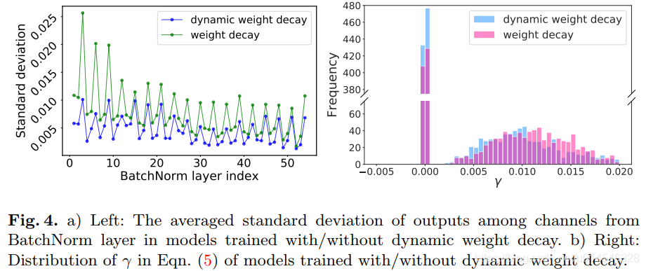 多了一个 S(xi)。S (xi) 是特性的度量标准,它可以根据任务有多个定义。本文的目标是根据特征稳定信道间的权重分布。因此,本文使用全局平均池 (GAP)[42] 作为特定通道的度量,如上面最后一个公式。使用 GAP 度量的动态权值衰减保证了产生大值特征的权值被抑制,给出了如图4所示的紧凑和稳定的权值和输出分布。