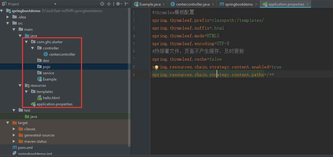 springboot 默认会有一个 application.properties 文件,我们可以在 resources 下 手动创建一个,为其添加 thymeleaf 的配置,实际上,数据源(spring.datasource.name)等都可以在此配置
