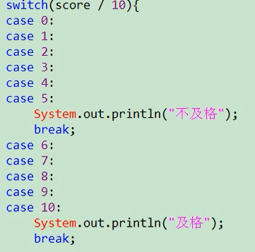 切记switch变量不能使用范围,而当情况种数较多时,一一列出显然不必,switch结构具有多个case可以合并的性质。