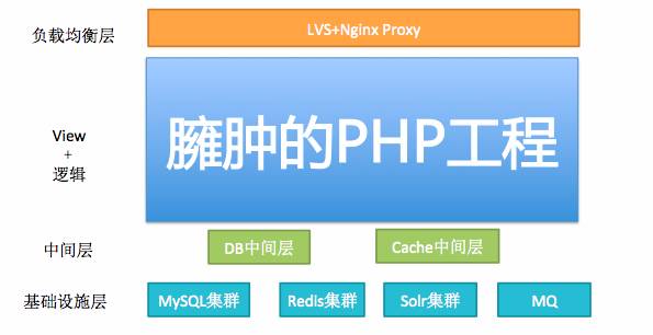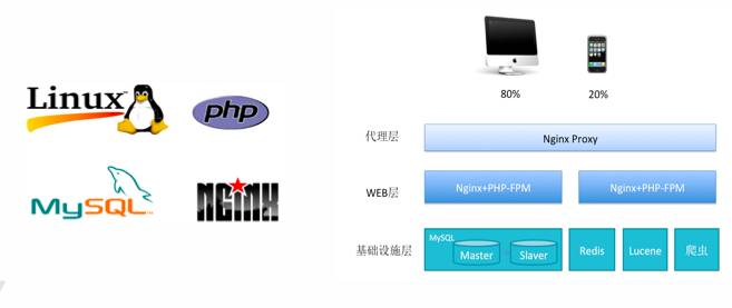如何理解?最初的时候,产品和业务形态都处于摸索期,业务复杂度不高,访问量不大,软件能够尽快跑起来推向市场是最重要的,所以架构上不设计的很复杂,单体或分层架构足矣。如下面典型的LNMP架构: