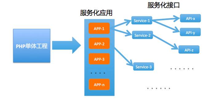 这时耦合严重,牵一发而动全身,开发效率日渐低下,所以要做的事情就是一个字,拆(专业说法:服务化拆分),如下图所示: