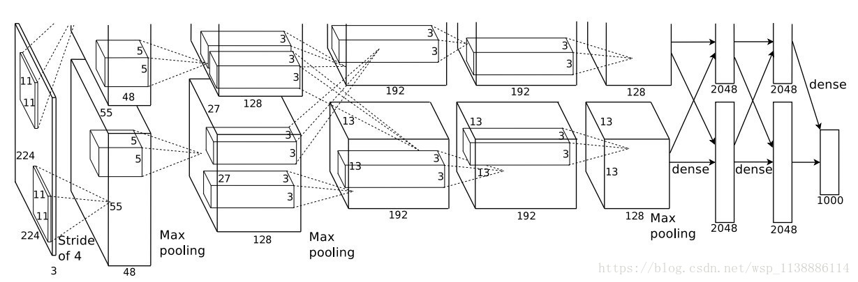 诞生于2012年,因为当时用了两个GPU(硬件设备差),所以结构图是2组并行