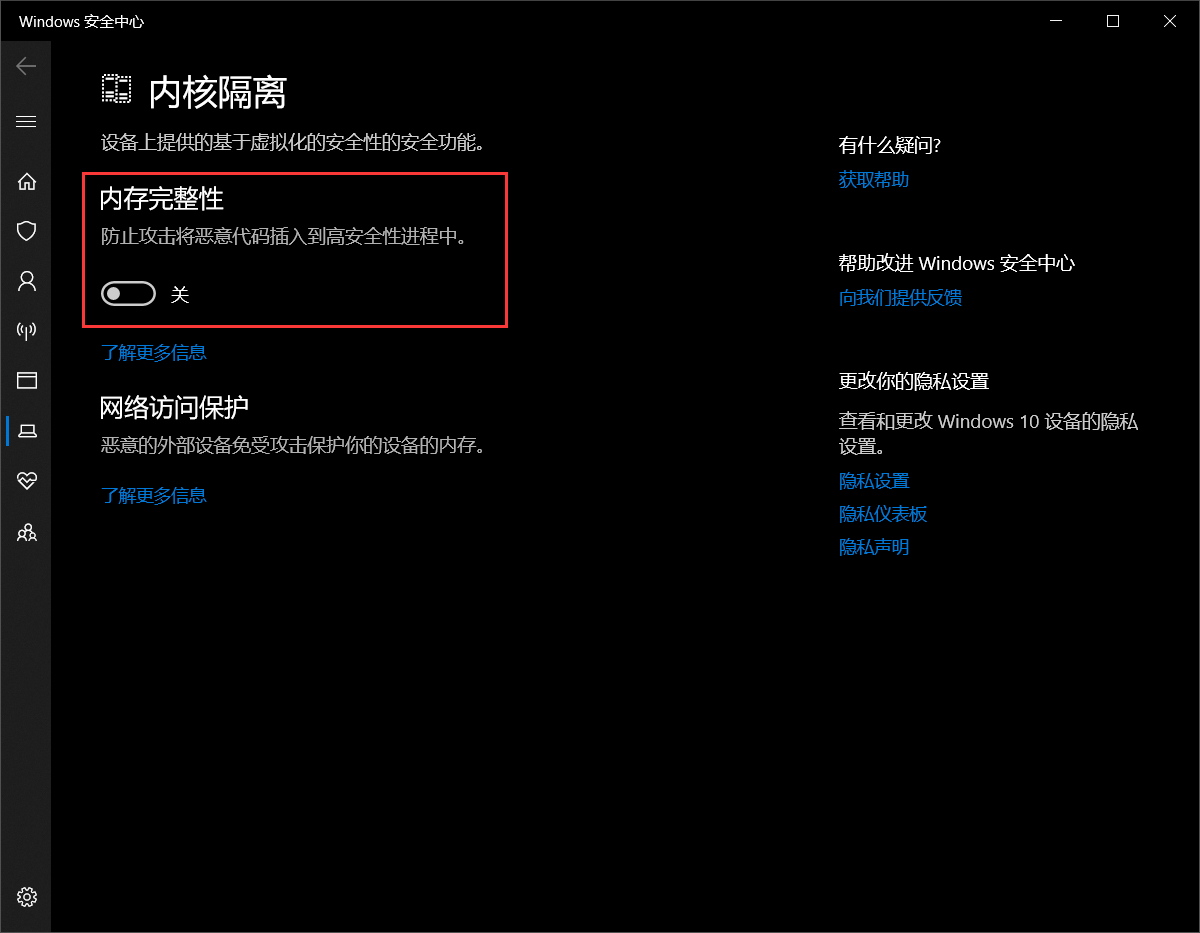 vmware workstation 与 device/credential guard 不兼容 当打开vmware workstation运行虚拟机是出现 device/credential guard 在确认关闭Hyper-V还是解决不了问题的可以通过以下方法 1、打开设置 2、搜索 内核隔离 并且关闭它 3、再次运行虚拟机 解决问题 关注公众号: 来源:oschina链接:https://my.oschina.net/u/4339825/blog/3318815 标签 vmware hyper