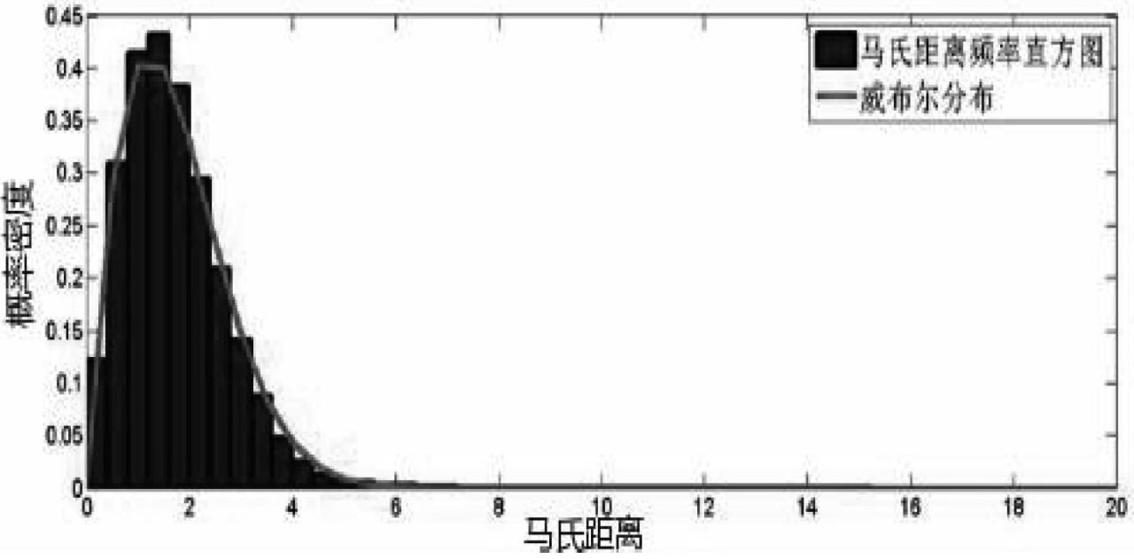 在训练阶段获取到的马氏距离值符合双函数威布尔分布, 如图3所示。 通过获取到的马氏距离值利用最小二乘法确定威布尔分布函数: