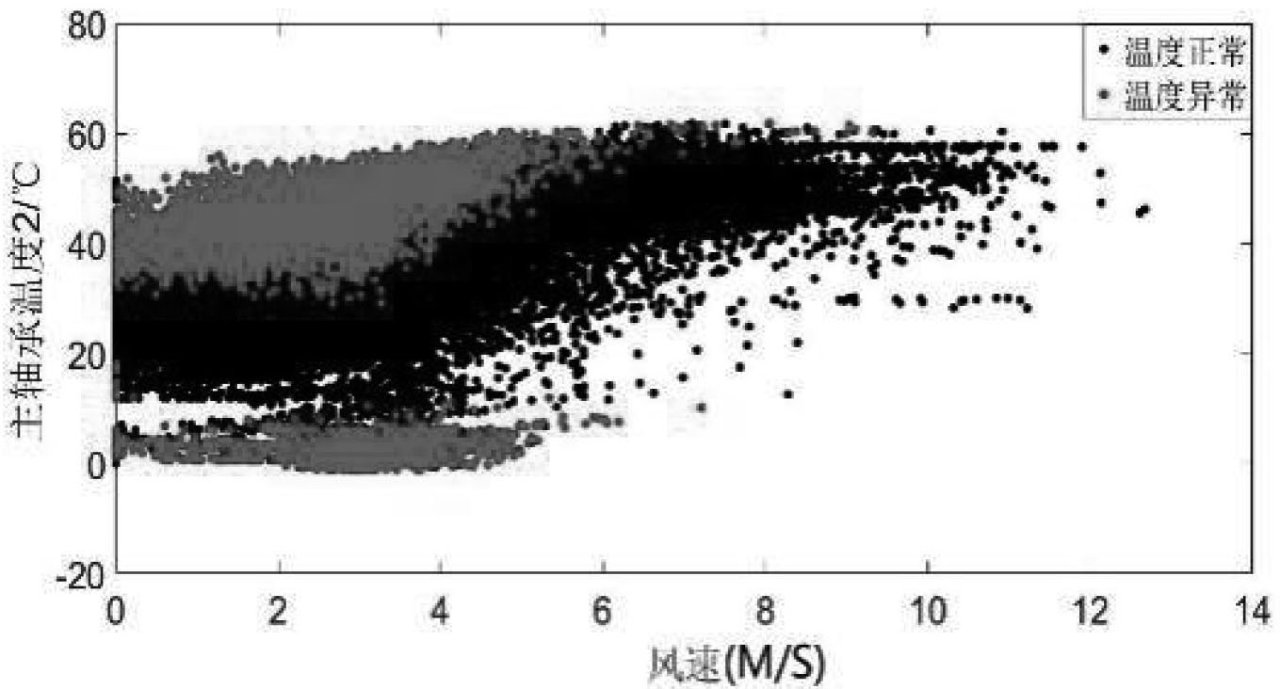 根据第2节所提到的方法对主轴承温度2数据进行预处理。 如图4所示选取输入参数为自变量对主轴承温度2分别进行异常数据滤除, 同时当主轴承温度2处于异常时, 滤除对应所有输入参数数据。 如图5所示, 当主轴承温度2处于异常状态时, 滤除对应的输入参数如风速、 轮廓转速、 机舱温度等数据。 将滤除后的数据用于神经网络训练和测试。