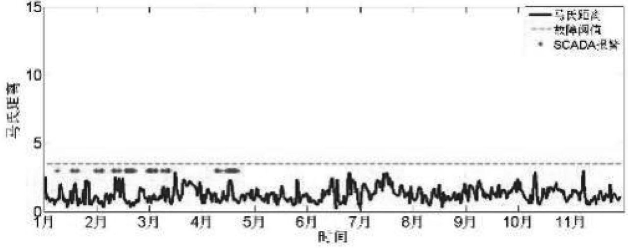 使用本文方法对相同型号风机P07在2016年1月到2017年1月进行主轴承故障诊断, 结果如图9所示。由图9可知, 该风机SCADA系统在1月出现第一次报警,随着时间的增加SCADA系统报警数量增加。 而根据本文方法, 马氏距离的值全程均未曾超过阈值, 可以得到主轴承没有发生故障的结论, 与事实相符。 可见我们提出的方法, 还能辅助风场业主分辨现有SCADA系统报警是否有效, 有利于风场业主制定有效的维护计划。