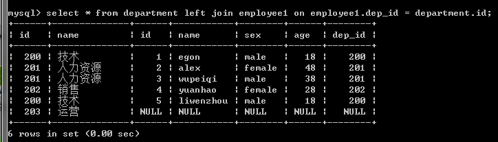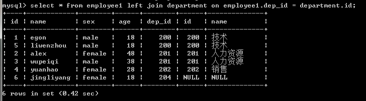 select * from department left join employee1 on department.id=employee1.dep_id;