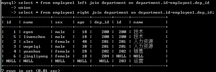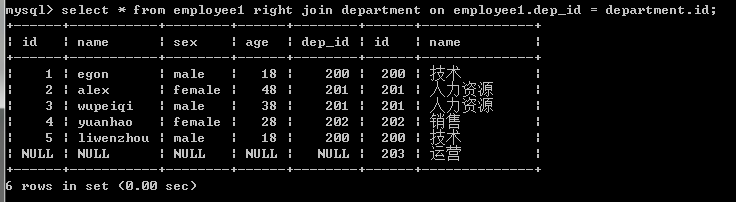 select * from department right join employee1 on department.id=employee1.dep_id;