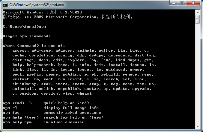 安装完成,打开Windows 命令提示符,敲入“npm”命令回车。