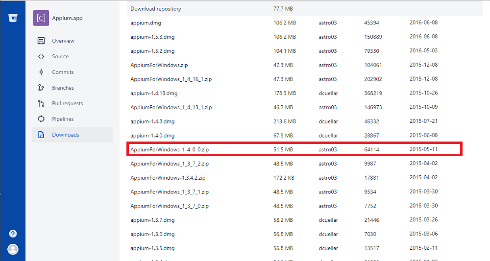 当前最新版本为AppiumForWindows_1_4_0_0.zip ,注意这是一个Windows 版本,如果你的电脑为MAC请下载appium-1.3.7.dmg。虽然你已经看到了这些下载包,但我不保证你能下载的下来。原因你懂的~!