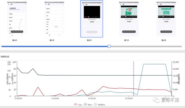 上图是用Xtest进行多机联测后一台设备的性能数据展示。从截图可以看到当进入小程序的视频界面开始播放后(第6步),曲线图的红色线(CPU)开始斜坡上升,随着视频加载缓存(第7、8步),代表上下行流量的绿色线(NetFlow)开始陡增。嗯,还是比较符合人类宏观认知理论的。如果配合脚本的场景编写,应该很容易就可以完成压测中的性能数据收集,并根据图片手顺定位哪步操作会导致性能数据异常。